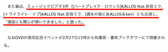 また最近、ミュージックビデオ3作([ハートブレイク・ロマンス]KALLOS feat.初音ミク、[トワイライト・イブ]KALLOS feat.初音ミク、[週末の夜に]KALLOS&ken)にも出演し、「演技にも関心が沸いてきました」と語った。